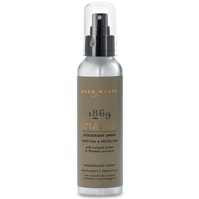 Acca Kappa 1869 Deodorant Spray is speciaal ontwikkeld voor de mannenhuid en biedt effectieve bescherming tegen nare geurtjes. De formule bevat zuiverende en beschermende ingrediënten zoals IJslands korstmos, weegbree en klis, die samen zorgen voor langdurige frisheid en geurcontrole. Deze deodorant heeft geen afsluitende werking, waardoor de poriën kunnen ademen, en bevat allantoïne, die een verzachtende werking op de huid heeft. Vrij van alcohol en met een niet-vette textuur, biedt het comfort en verzorging zonder irritatie.