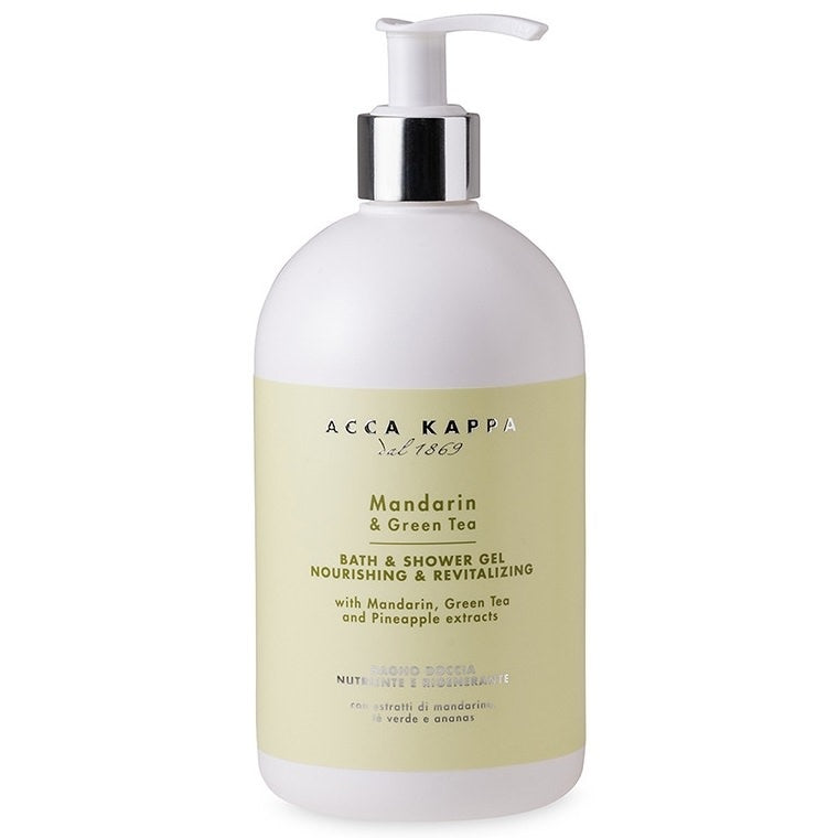 Acca Kappa Mandarin & Green Tea Bad en Douchegel is een verfrissende en revitaliserende bad- en douchegel die de huid zacht en gehydrateerd achterlaat. Deze luxueuze bad- en douchegel is doordrenkt met de verfrissende geur van mandarijn en groene thee, die je zintuigen prikkelen. De zorgvuldig samengestelde formule reinigt de huid op milde wijze, terwijl natuurlijke extracten van mandarijn en groene thee de huid voeden en beschermen. Perfect voor dagelijks gebruik, deze douchegel biedt een zijdezacht schuim en laat een subtiele, verfrissende geur achter.