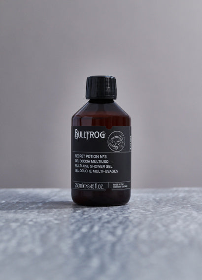 Bullfrog Multi-Use Shower Gel N.3 Secret Potion is een veelzijdige en diep reinigende shower gel die zowel als shampoo, douchegel en gezichtsreiniger gebruikt kan worden. Deze alles-in-één formule biedt ultiem gemak voor de man die waarde hecht aan efficiëntie. Het reinigt grondig het haar, gezicht en lichaam, terwijl het een verzorgde en frisse uitstraling achterlaat. De huid wordt zachtjes geparfumeerd met het karakteristieke aroma van No.3 Secret Potion, een robuuste en verfijnde geur die de hele dag blijft hangen. Dit kenmerkende parfum heeft een mannelijke, stoere geur die een gevoel van kracht en zelfvertrouwen uitstraalt. Perfect voor de moderne man die zowel gemak als luxe zoekt in zijn dagelijkse verzorgingsroutine.
