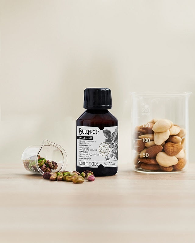 Bullfrog Nourishing Restorative Shampoo bezit een geur herinnert aan de omhullende noten van pistache en amandel, en is perfect voor liefhebbers van verfijnde en aromatische tonen.