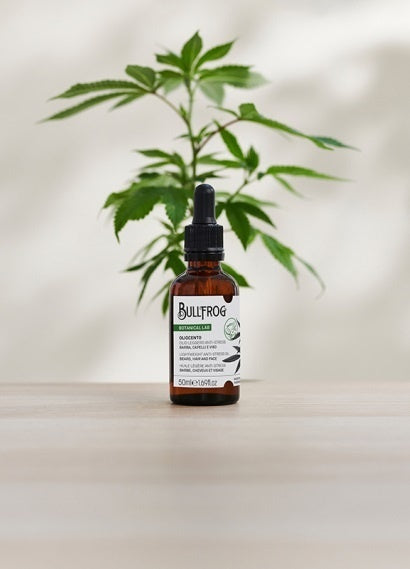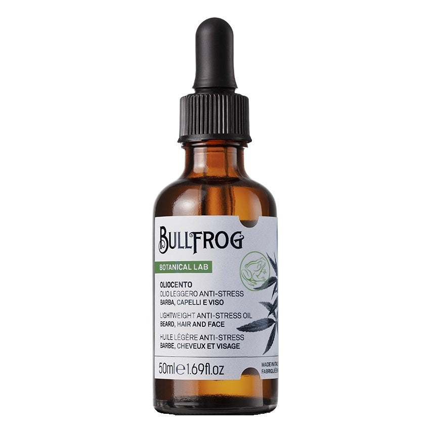Bullfrog Oliocento Lightweight Anti-Stress Oil is een luxe, 100% natuurlijke olie met een lichte, bijna droge textuur die moeiteloos in de huid word opgenomen. Deze veelzijdige olie is speciaal ontwikkeld om een scala aan verzorgende functies te vervullen: hij verzacht, verheldert, hydrateert, voedt en kalmeert zowel baard, huid als haar. De verfijnde formule is verrijkt met hennepolie, die de huid een verkwikkende, gezonde gloed geeft en helpt bij het verminderen van stress en spanning. Met zijn natuurlijke geur en veelzijdige werking is deze olie de perfecte keuze voor een complete verzorging en een verfrissende uitstraling, terwijl het tegelijkertijd een subtiele luxe toevoegt aan je dagelijkse routine.
