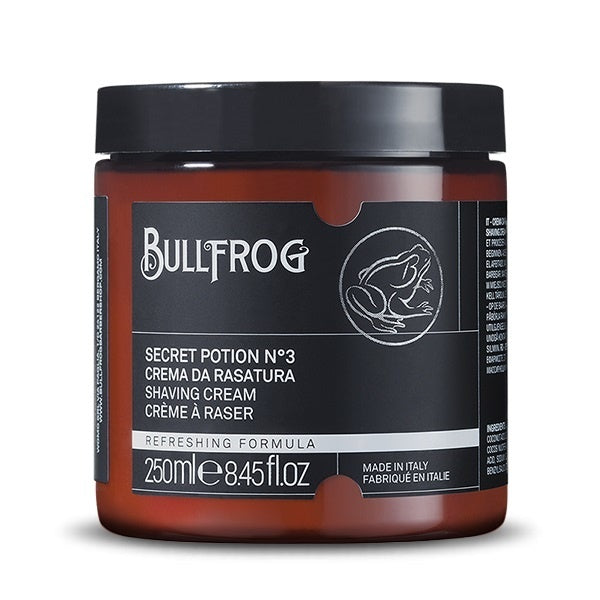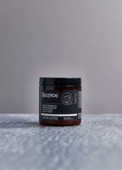 Bullfrog Scheercrème N.3 Secret bezit een zachte textuur voor de man die op zoek is naar een product met een verfrissend en verkwikkend effect. Deze activerende scheercrème schud de huid wakker en helpt de baard voor te bereiden op een scheerbeurt die de huid aangenaam fris, glad en zacht maakt.