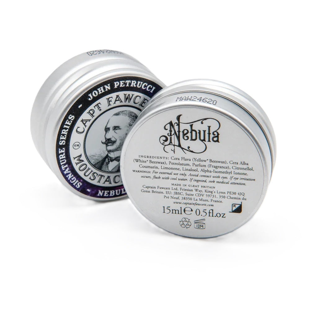 Captain Fawcett Nebula Snorrenwax biedt een meeslepende geursensatie. Het begint met opwindende topnoten van bergamot en aromatische mirte, verweven met een bitterzoete toets van grapefruit. Deze geur ontvouwt zich naar een intens hart van aardse, violette orris, donkere koffie en hardnekkig houtachtige ceder. Een pulserende vleug van verleidelijke muskus volgt, met een rokerige achtergrondnoot die doordrenkt is met vetiver en luxueus leer. De geurcombinatie wekt een aura van avontuur en elegantie op, waardoor de Captain Fawcett Nebula Snorrenwax een ware zintuiglijke ervaring is.