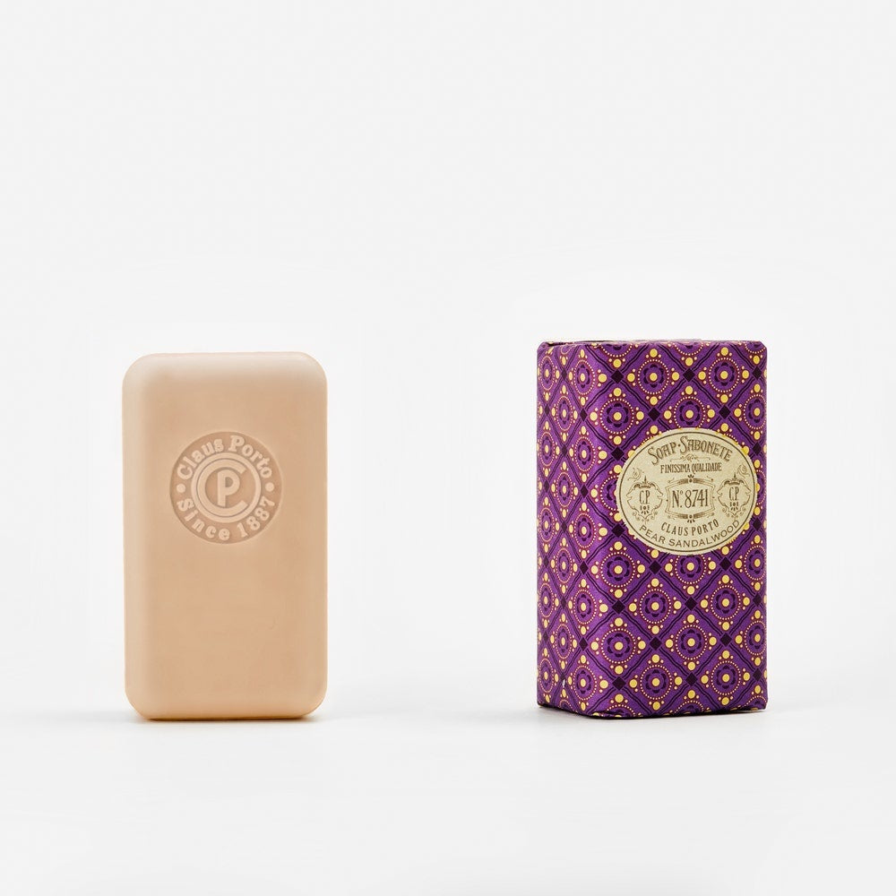 Claus Porto Soap Bar Mini 8741 Pear Sandalwood combineert de zoete, fruitige geur van peer met de warme, houtachtige tonen van sandelhout voor een frisse en kruidige geur. Deze handgemaakte zeep uit Portugal is verrijkt met hydraterende 100% plantaardige oliën, waardoor de huid op milde wijze wordt gereinigd en verzorgd. De rijke, romige textuur laat de huid zacht en gevoed aanvoelen, terwijl de elegant ontworpen verpakking een vleugje vintage charme toevoegt. Perfect voor dagelijks gebruik of als stijlvol cadeau.