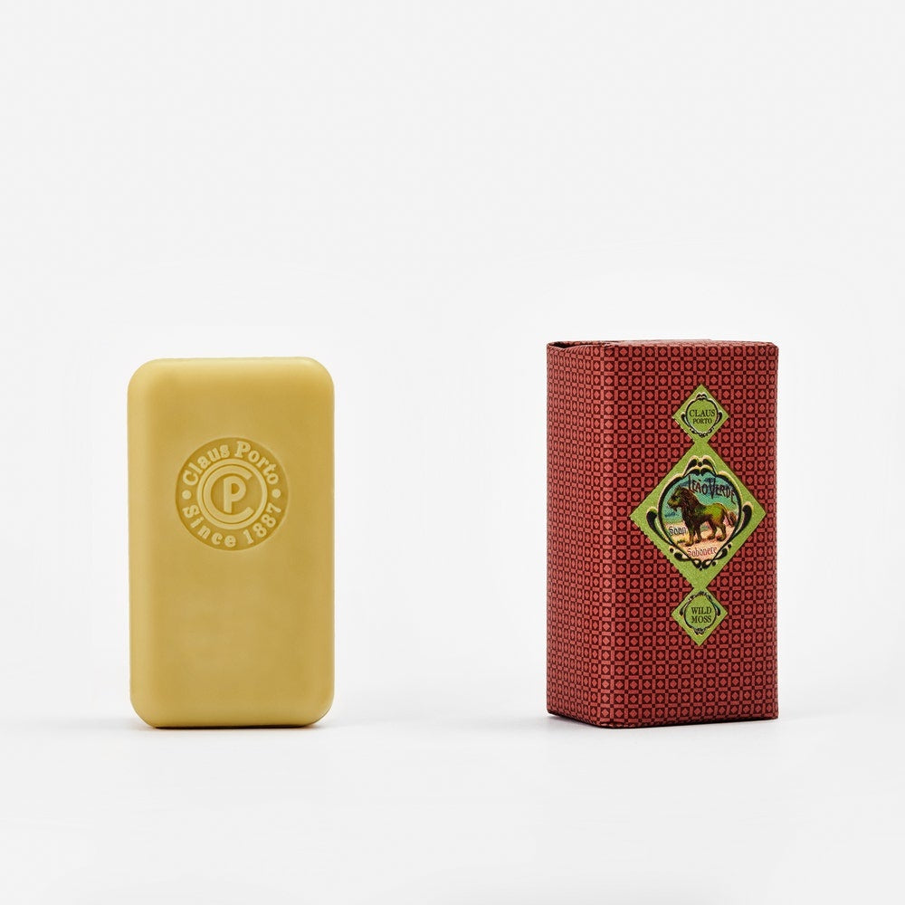Claus Porto Soap Bar Mini Leão Verde Wild Moss is een luxe zeep die een verfrissende en aardse geur biedt, geïnspireerd door de wilde natuur. De zeep heeft een 100% plantaardige basis, gemaakt met ingrediënten die de huid verzorgen en hydrateren. Het resultaat is een rijk, romig schuim dat je huid reinigt zonder deze uit te drogen. De geur van de zeep combineert kruidige topnoten met een hart van kruidnagel en dennen, en wordt afgerond met warme basisnoten van wierook. Deze zeep biedt een unieke geur die zowel je zintuigen prikkelt als je huid verzorgt, ideaal voor een frisse ochtend of een kalmerend avondritueel.