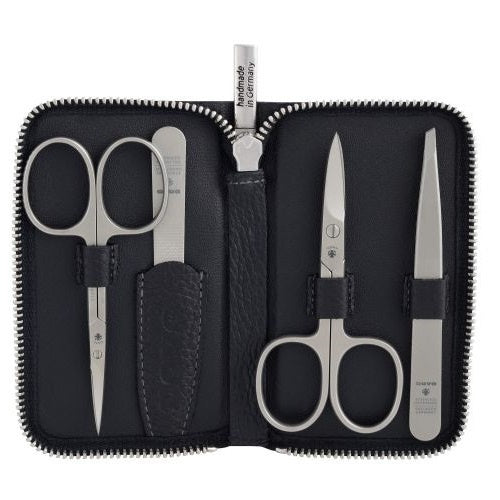 Dovo Manicureset No.5 is een complete en stijlvolle set die alles biedt wat je nodig hebt voor optimale nagelverzorging, zowel thuis als onderweg. Deze zorgvuldig samengestelde set bevat een hoogwaardige nagelschaar, een precisie-nagelriemschaar, een nagelvijl en een pincet, elk ontworpen voor moeiteloos gebruik en maximale controle. Met deze gereedschappen kun je je nagels en nagelriemen op professionele wijze verzorgen, zodat je altijd een nette en verzorgde uitstraling hebt. Wat deze set bijzonder maakt, is de handige verpakking in een zwart etui van echt rundsleer, wat zorgt voor een elegante uitstraling en duurzaamheid.