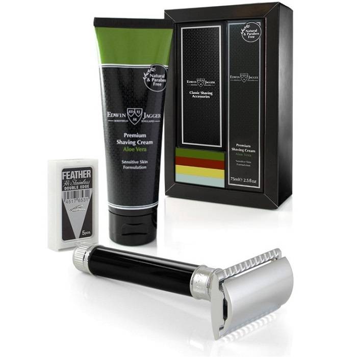 Edwin Jagger Double Edge Razor + Scheercrème Aloe Vera is het perfecte duo voor een luxe en traditionele scheerbeurt. Het hoogwaardige scheermes met een gesloten kam biedt een veilige, nauwkeurige en comfortabele scheerbeurt, ideaal voor zowel beginners als ervaren gebruikers. De stijlvolle handgreep met een stevige grip zorgt voor optimale controle tijdens het scheren. De bijgeleverde Scheercrème Aloe Vera is verrijkt met natuurlijke ingrediënten die de huid diep hydrateren en irritaties minimaliseren. De frisse, subtiele geur van aloë vera voegt een verfijnde touch toe aan je scheerroutine. Samen zorgen deze producten voor een gladde, verzorgde huid en een scheerbeurt die zowel functioneel als luxueus is.