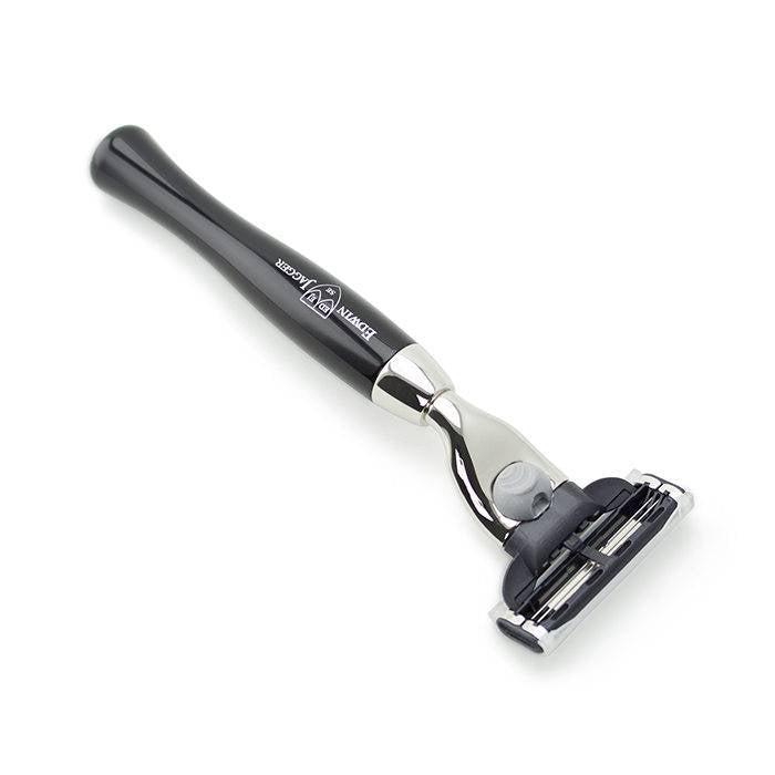 Edwin Jagger Mach3 Scheermes Zwart is ontworpen met een handvat van zwart edelkunsthars, dat een strak contrast vormt met de helder verchroomde accenten. Het gebruik van dit materiaal zorgt voor een luxe uitstraling en biedt tegelijkertijd een uitstekende grip en controle. Het scheermes is geschikt voor de Gillette® Mach3™ scheermesjes, waardoor je verzekerd bent van een glad, comfortabel en veilig scheerresultaat. Het hoogwaardige handvat maakt het eenvoudig om het mes stevig vast te houden, wat de precisie van je scheerbeurt ten goede komt.
