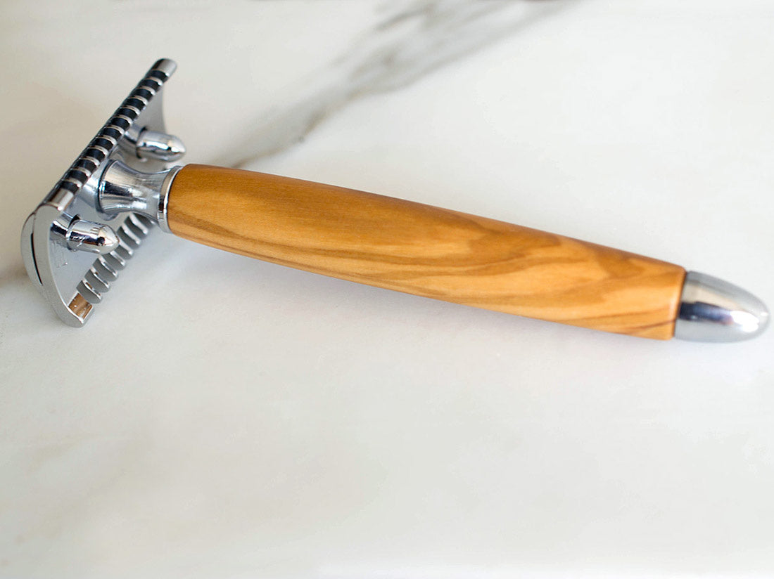 Fatip Safety Razor Olive Wood – Open Kam heeft een handvat van hoogwaardig olijfhout, dat bekendstaat om zijn levensduur en prachtige, natuurlijke nerfpatronen. De kop en voet van het scheermes zijn gemaakt uit verchroomd messing, wat het mes een lange levensduur geeft en bescherming biedt tegen corrosie. Dit combinatie van materialen zorgt voor een goed uitgebalanceerd scheermes dat stevig in de hand ligt en zorgt voor een comfortabele, stabiele scheerbeurt.