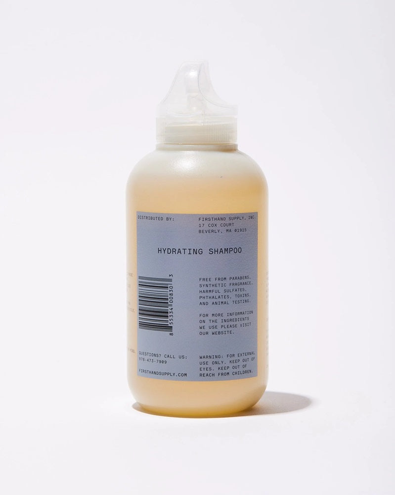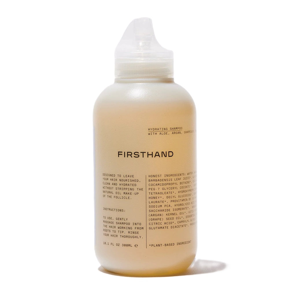 Firsthand Supply Hydrating Shampoo is zorgvuldig samengesteld met krachtige natuurlijke ingrediënten. Aloë Vera bevordert haargroei en kalmeert de hoofdhuid dankzij de rijke aanwezigheid van vitaminen en mineralen. Arganolie creëert een beschermende laag om het haar, waardoor schadelijke stoffen van buitenaf geen kans krijgen en je haar zijn glans en stevigheid behoudt. Druivenpitolie bevat een hoge concentratie aan vitamine E, wordt snel opgenomen door huid en haar, en helpt roos te voorkomen. Deze olie biedt ook bescherming tegen hitte. De shampoo is volledig vrij van parabenen, synthetische geurstoffen, sulfaten, ftalaten, toxines en wordt niet getest op dieren.