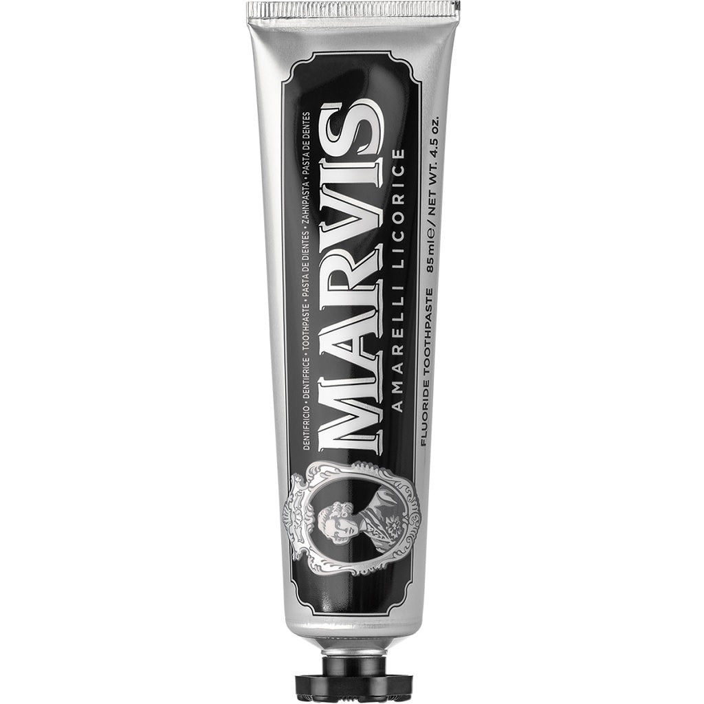 Marvis Tandpasta Amarelli Licorice is samengesteld met een uniek mengsel van reinigingspoeders dat niet alleen zorgt voor een stralend witte glimlach, maar ook beschadiging van het glazuur en tandbeen helpt voorkomen. De toevoeging van fluoride en xylitol draagt bij aan het voorkomen van gaatjes en houdt de bacteriële flora in de mond onder controle. Geniet van de verfijnde smaak van zoethout en ervaar een frisse adem en optimale mondhygiëne
