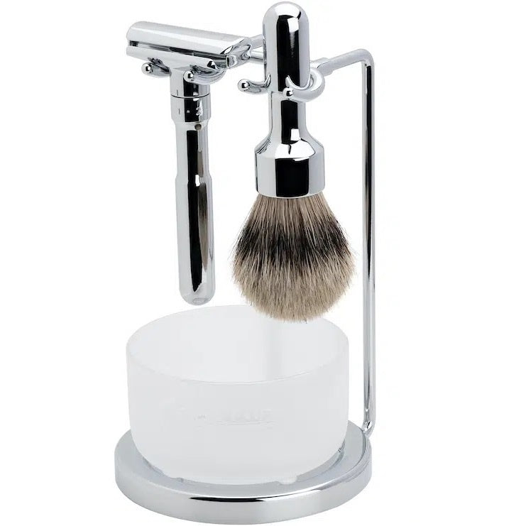 Merkur Scheerset Futur 751 belichaamt vakmanschap en tijdloze stijl in de wereld van nat scheren. Dit meesterwerk van Duitse techniek en ontwerp biedt alles wat je nodig hebt voor een gladde, comfortabele scheerervaring. De set bevat de Scheerkwast Silvertip, de Merkur Futur 701 Double Edge Safety Razor, een moderne scheerborstelstandaard en een luxe scheerkom, allemaal met een elegante verchroomde afwerking en een modern ergonomisch ontwerp. De scheerkwast is voorzien van hoogwaardige dassenharen borstels die zorgen voor rijk schuim en een zacht gevoel op je huid. Het scheermes heeft een verstelbare scheerkop waarmee je de scheerhoek naar jouw voorkeur kunt aanpassen, wat ideaal is voor zowel beginners als ervaren scheerders. Kies voor de Merkur Scheerset Futur 751 en ervaar het plezier van scheren op het hoogste niveau van kwaliteit en comfort. Deze set biedt een verfijnde scheerbeleving die elke man verdient.