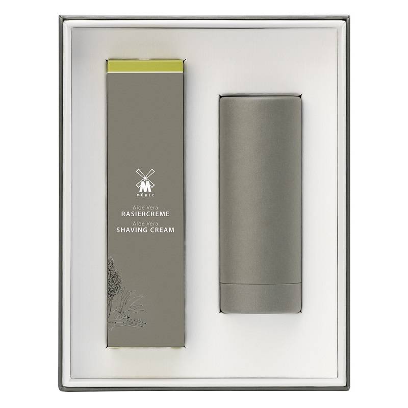 Muhle Giftbox Starter Set is het ideale cadeau voor de moderne man die op zoek is naar een starter set voor luxe scheerbeurt. Deze stijlvolle set bevat de Scheercrème Aloe Vera, die de huid hydrateert en kalmeert met de verfrissende werking van aloë vera, en de Scheerkwast Black Fibre Rytmo Zwart, die zorgt voor een zijdezachte textuur voor het aanbrengen van scheerschuim. De scheerkwast heeft synthetische vezels die snel drogen en duurzaam zijn, wat de set perfect maakt voor dagelijks gebruik. De Muhle Giftbox Starter Set biedt een complete scheerbeurt met optimale verzorging, ideaal voor beginners die niet weten wat ze moeten kopen.