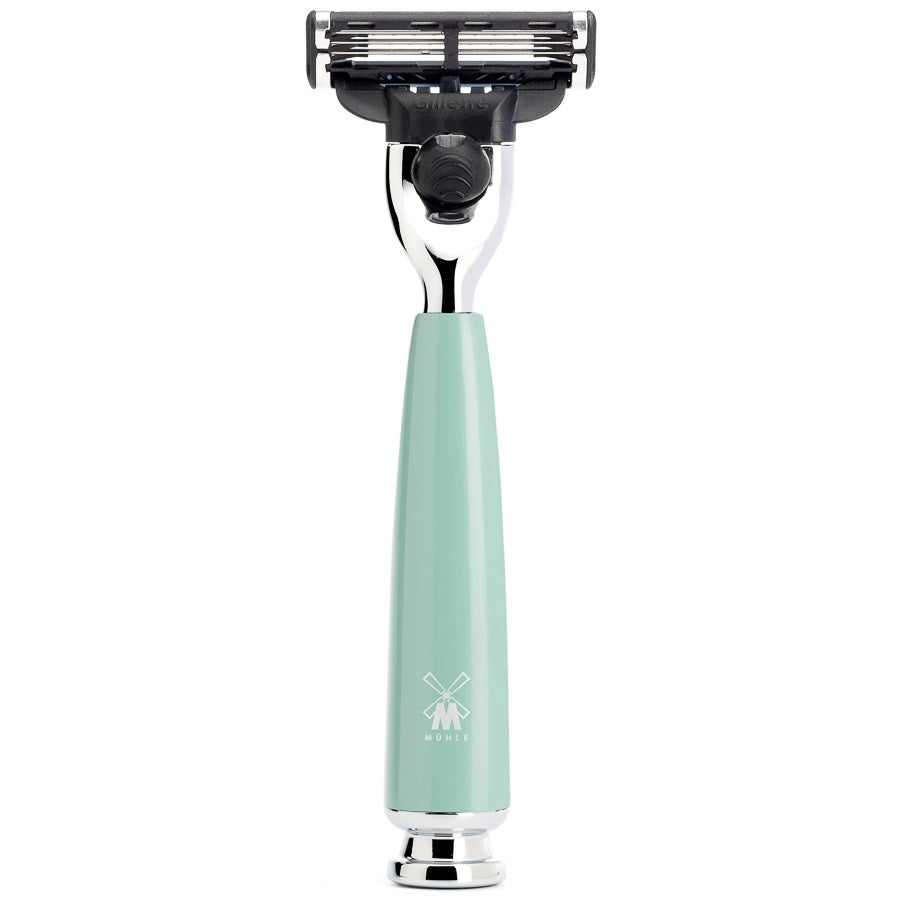 Muhle Mach3 Scheermes Rytmo Mint Groen biedt een comfortabele scheerbeurt met een stijlvol handvat van gepolijst edelhars en chromen accenten voor luxe en grip. Lees meer