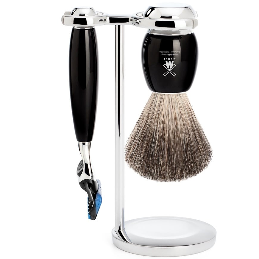 Muhle Scheerset Fusion Vivo Zwart (3-delig) biedt de perfecte combinatie van vakmanschap, luxe en functionaliteit voor de moderne scheerliefhebber. Deze set bestaat uit een Fusion scheermes, een graudas scheerkwast en een houder van verchroomd metaal, allemaal met een klassiek zwart handvat. Het handvat biedt een stijlvolle en klassieke uitstraling en een comfortabele grip, terwijl de chromen accenten de set een verfijnde uitstraling geven. Het Fusion systeem zorgt voor een gladde en comfortabele scheerbeurt dankzij de verwisselbare mesjes die gemakkelijk te vervangen zijn. De bijbehorende scheerkwast met zachte haren zorgt voor een optimaal schuimresultaat. Deze 3-delige set is de ideale keuze voor wie zowel stijl als functionaliteit in zijn scheerroutine waardeert.