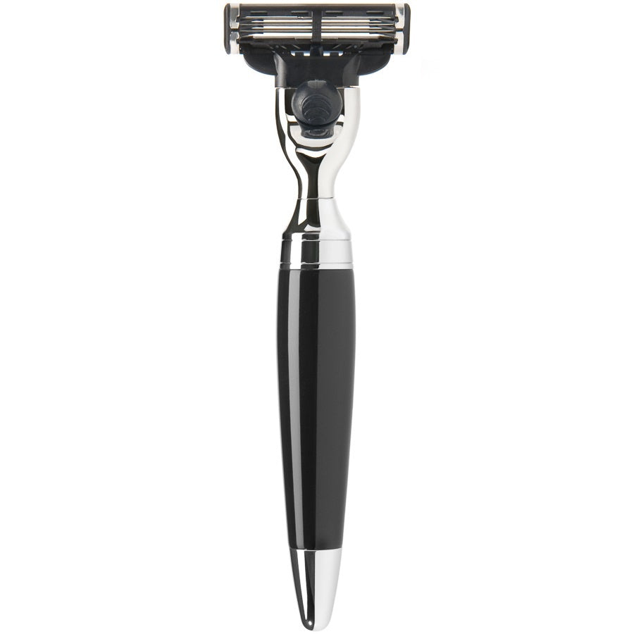 Muhle Mach3 Scheermes Stylo Zwart biedt een comfortabele, nauwkeurige scheerbeurt met een strak, zwart kunststof handvat en Mach3 mesjes voor uitstekende prestaties. Het verchroomde metaal geeft het scheermes een elegante uitstraling en zorgt voor een stevige grip. Deze combinatie van lichtgewicht en duurzame materialen biedt zowel stijl als functionaliteit, ideaal voor mannen die een gladde, irritatieloze afwerking wensen. Perfect voor dagelijks gebruik en een lange levensduur.