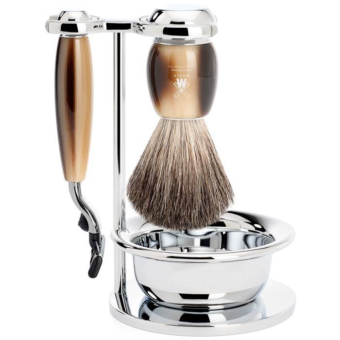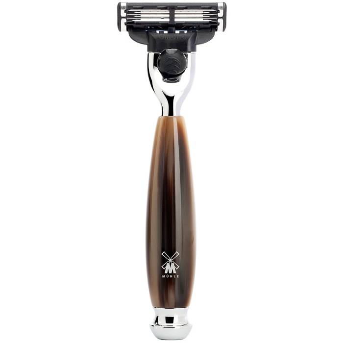 Muhle Scheerset Mach3 Vivo Hoorn (4-delig) is een luxe scheerset met een Mach3 scheermes, Graudas scheerkwast, standaard en RVS zeepbakje. Het handvat van kunststof met een hoornlook geeft de set een unieke uitstraling. De zorgvuldig gepolijste hoorn zorgt voor een comfortabele grip, terwijl de Mach3 mesjes zorgen voor een gladde en efficiënte scheerbeurt. De graudas scheerkwast biedt een zachte en stevige verdeling van het scheerzeep. Deze set is ideaal voor wie op zoek is naar zowel stijl als functionaliteit in zijn scheerroutine.