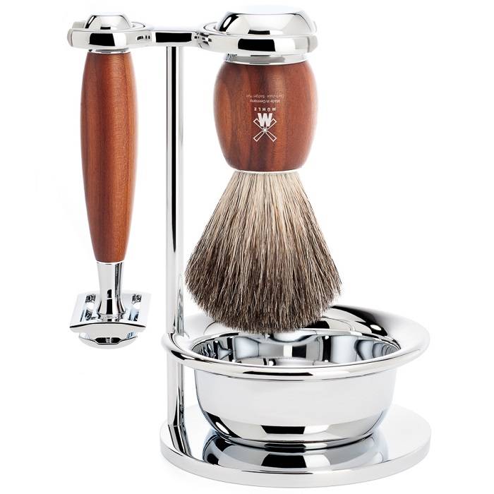 Muhle Scheerset Vivo Pruimenhout (4-delig) is een stijlvolle en complete set voor de traditionele natscheerder, bestaande uit een scheerkwast met graudas dassenhaar, een safety razor met gesloten kam, een elegante standaard en een scheerkom. Het handvat van zowel de kwast als het scheermes is gemaakt uit pruimenhout, wat zorgt voor een warme, luxe uitstraling en een prettige grip. De verchroomde accenten geven de set een moderne afwerking en extra levensduur. Dankzij het graudas dassenhaar ontstaat er moeiteloos rijk schuim, terwijl het gesloten kam scheermes garant staat voor een comfortabele, huidvriendelijke scheerbeurt.