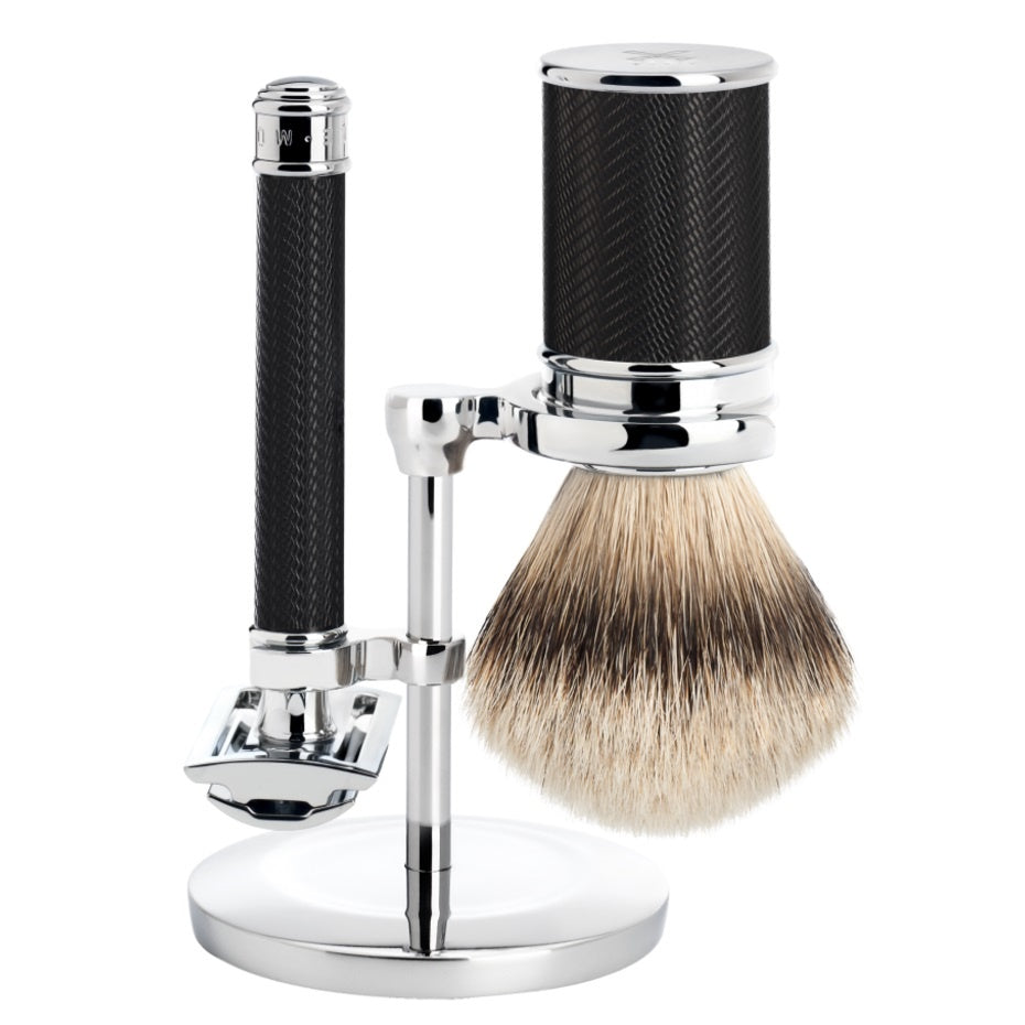 Muhle Scheerset Zwart (3-delig) is een complete set voor de echte scheerliefhebber die stijl en functionaliteit zoekt. Deze set bevat een scheermes, scheerkwast en scheerstandaard, elk met een luxe zwart handvat dat een elegante uitstraling biedt. Het scheermes is uitgerust met een roestvrijstalen kop en een gesloten kam voor een zachte scheerbeurt, ideaal voor zowel beginners als ervaren gebruikers. De scheerkwast heeft zachte haren die gemakkelijk schuim opkloppen voor een comfortabele scheerbeurt. De standaard houdt alle onderdelen netjes en georganiseerd.