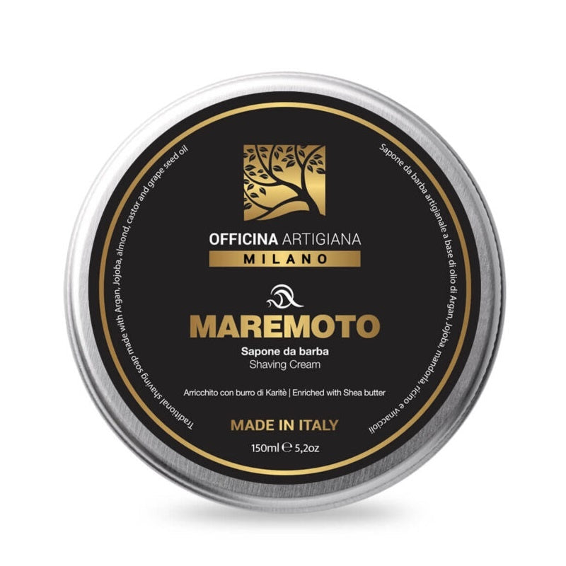 De Maremoto scheerzeep van Officina Artigiana Milano is samengesteld uit 46% fijne oliën (Jojoba, Argan, Amandel, Druivenpit en Castor) en shea boter; Officina Artigiana Milano zet zich volledig in voor de kwaliteit en kwantiteit van de gebruikte grondstoffen, die zuiver en gecertificeerd zijn. Het mengsel wordt vijf keer heet verwerkt, waarbij de ingrediënten in vijf verschillende stadia worden gemengd. Elk plantaardig vet wordt in verschillende tijden, stadia en hoeveelheden verwerkt. Een nauwgezette en complexe manuele handeling waardoor de kostbare oliën de huid voeden en gevoed houden, zelfs vele uren na het scheren, met werkelijk heilzame effecten op de gezichtshuid.