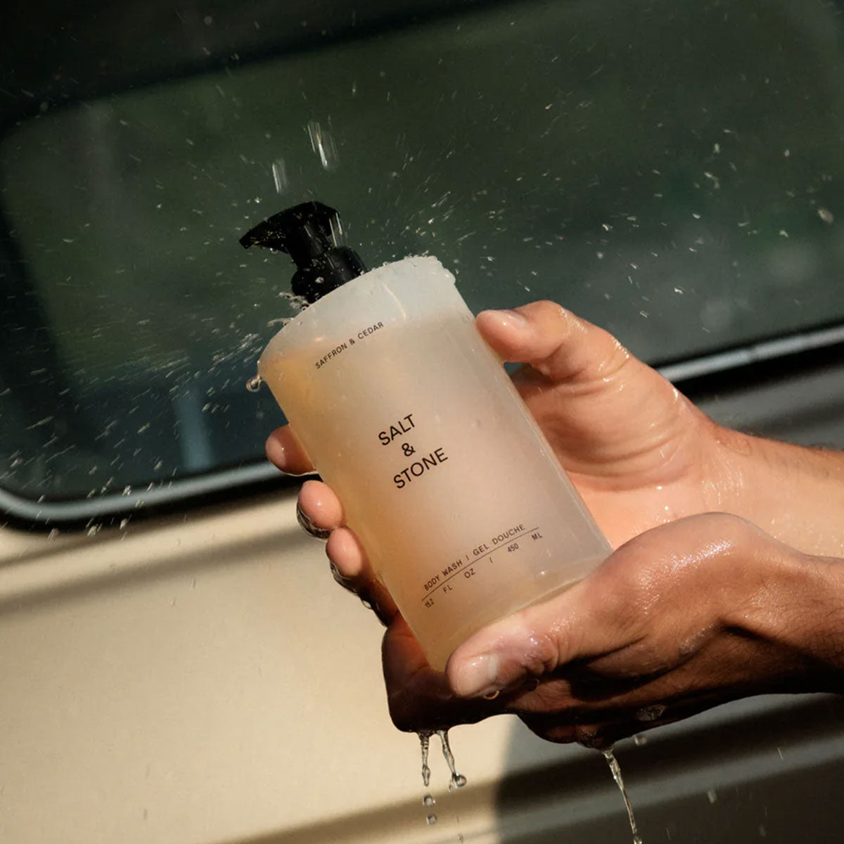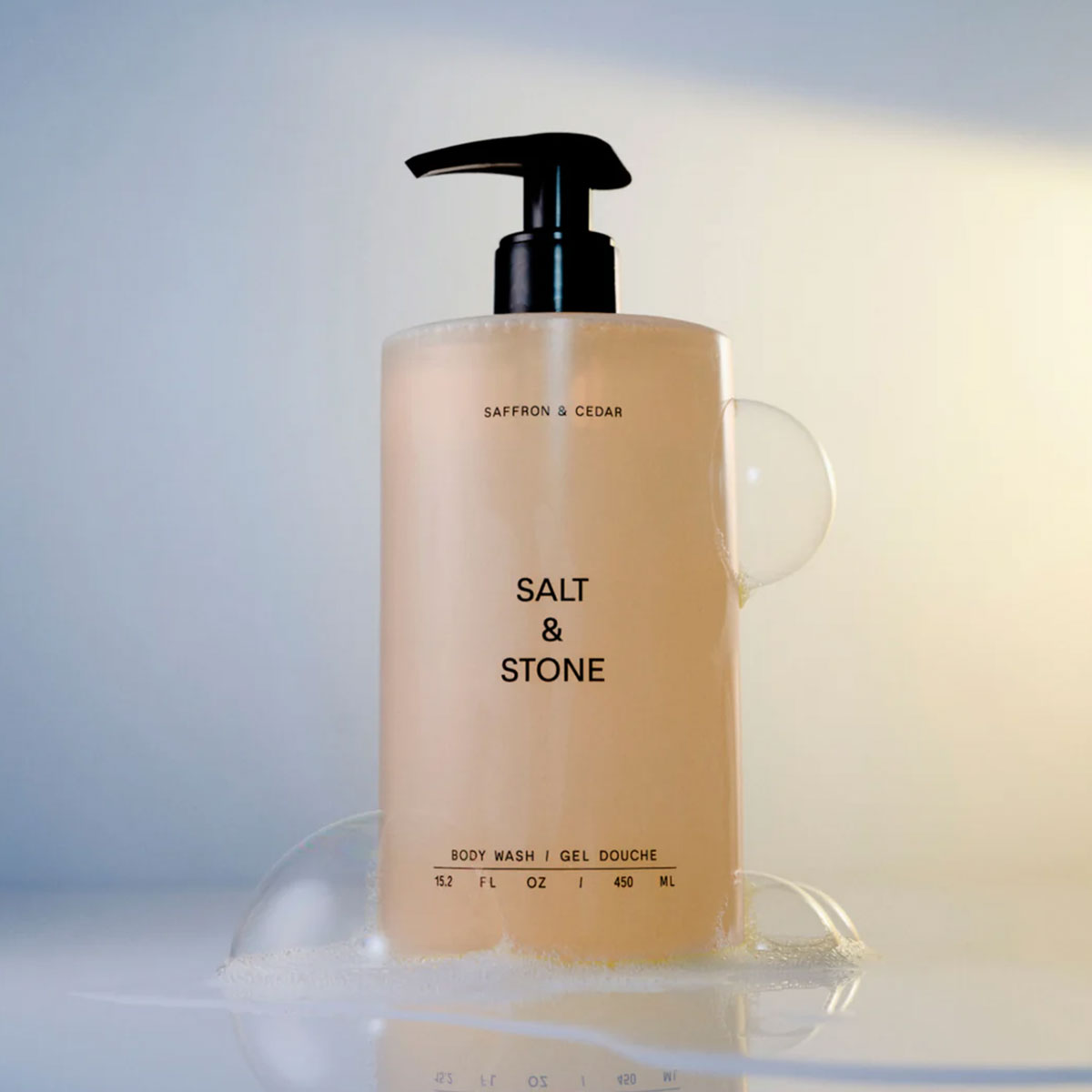 Salt & Stone Body Wash Saffron & Cedar heeft een warme, kruidige geur die je zintuigen verleidt. De topnoten van saffraan en neroli brengen een exotisch en kruidig aroma, terwijl de hartnoten van jasmijn, eikenmos en surfwas een frisse en houtachtige toon toevoegen. De basisnoten van suikerriet en cederhout zorgen voor een warme, aardse basis die de geur mooi in balans brengt.