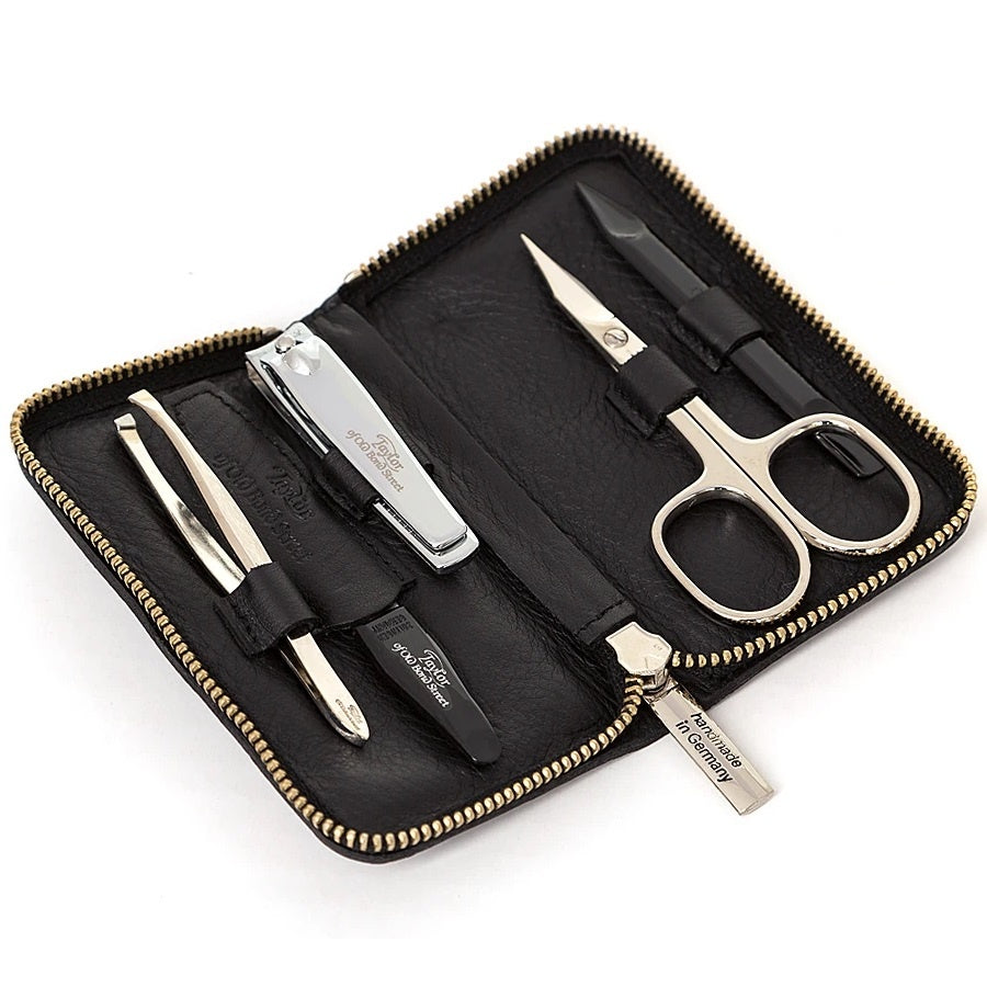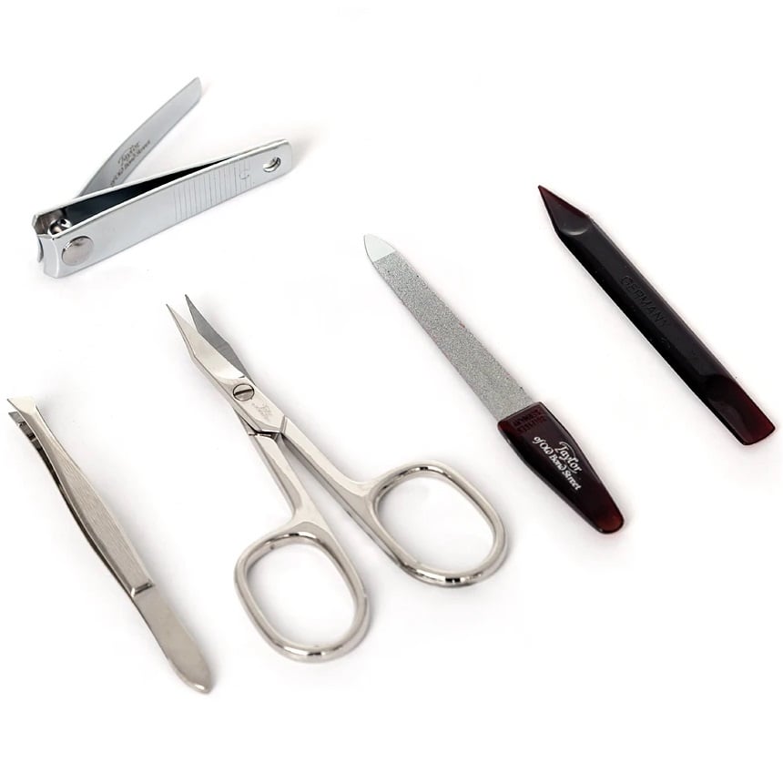 Taylor of Old Bond Street Manicureset Medium Zwart (5-delig) biedt een complete en stijlvolle oplossing voor je nagelverzorging. Deze set, samengesteld uit hoogwaardige materialen, wordt geleverd in een elegante zwarte etui. Het bevat vijf essentiële gereedschappen, waaronder een nagelschaar, nagelknipper, pincet, nagelvijl en nagelreiniger. Elk instrument is zorgvuldig gemaakt voor precisie en duurzaamheid, terwijl de zwarte etui een vleugje luxe toevoegt aan uw nagelverzorgingsroutine. Met deze manicureset kunt u gemakkelijk en professioneel je nagels onderhouden, waar je ook bent.
