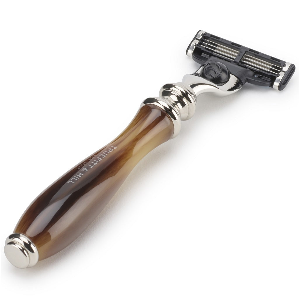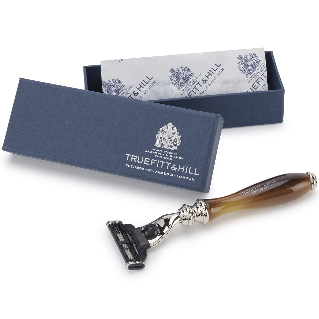 Truefitt & Hill Mach3 Scheermes Wellington Hoorn is voorzien van verzwaarde en ergonomisch handgemaakte scheerhendels, ontworpen om je de gladste en veiligste scheerbeurt te geven. Deze zorgvuldig vervaardigde handgreep, gemaakt van hoogwaardig materiaal, biedt een perfecte balans en grip, wat resulteert in ultieme controle tijdens het scheren. De precisie van de Mach3-scheermesjes, gecombineerd met de elegante en duurzame handgreep, zorgt ervoor dat elke scheerbeurt moeiteloos en comfortabel verloopt. Truefitt & Hill heeft met dit scheermes een perfecte combinatie van traditioneel vakmanschap en moderne technologie gecreëerd, waardoor het een onmisbaar item is voor de verfijnde gentleman.