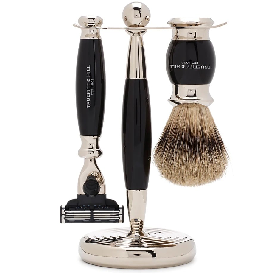 Truefitt & Hill Scheerset Mach3 Edwardian Zwart is een stijlvolle en luxueuze scheerset voor de moderne gentleman. De set bevat een perfect uitgebalanceerd scheermes, bijpassende handgemaakte scheerkwast van fijn dassenhaar en elegante chromen standaard. Prachtig met de hand afgewerkt een elegante, zwarte tint wat zorgt voor een tijdloze en stijlvolle uitstraling.